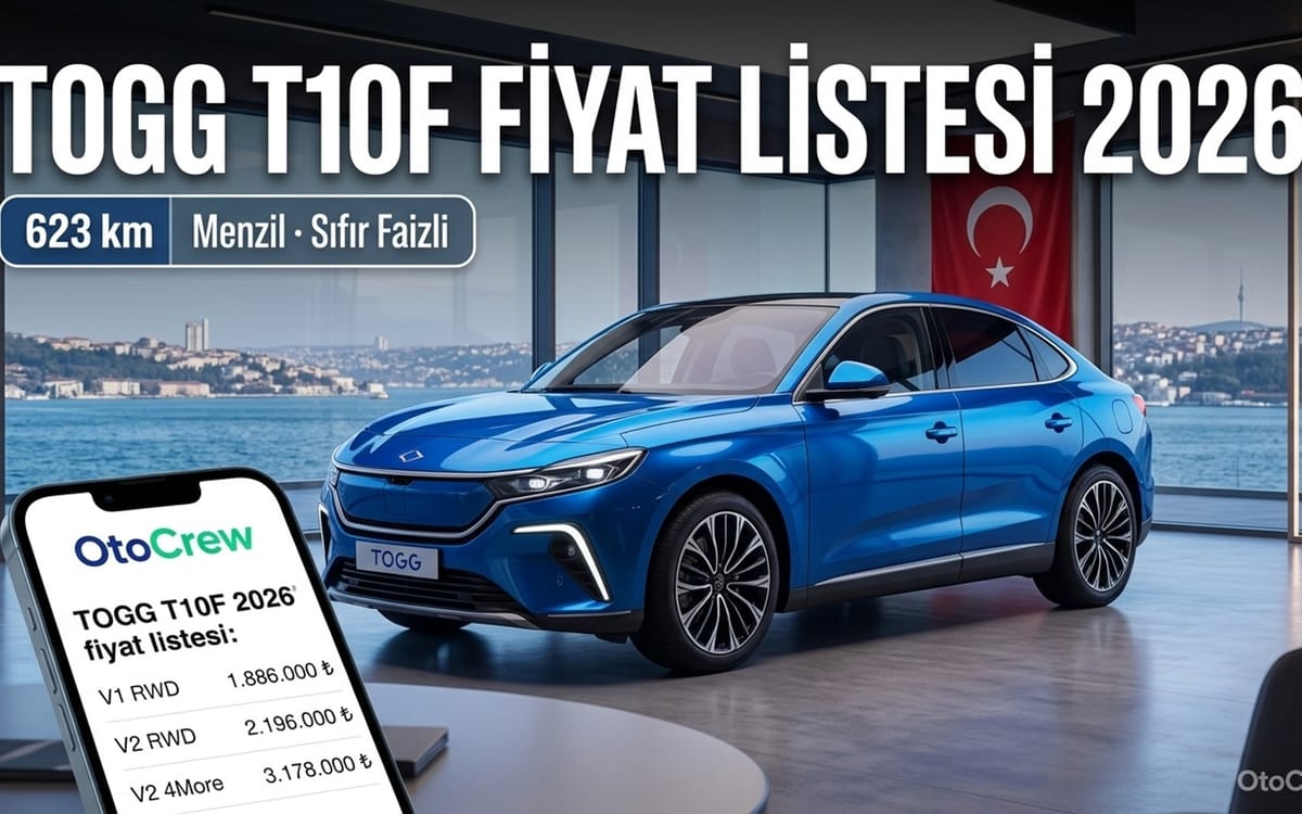 TOGG T10F, Türkiye'nin yerli otomobil markası TOGG'un fastback model olarak 2025'te tanıttığı ve 2026'da güncellenen fiyat listesiyle satışa devam eden elektrikli aracıdır. T10F T10X SUV'un türevi olarak daha sportif bir siluete ve 623 km'ye kadar ulaşan menzile sahiptir. 2026 Ocak itibarıyla güncel fiyat listesi versiyonlara göre 1.886.000 TL - 3.178.000 TL aralığında. Bu rehberde güncel fiyatları, versiyonları, paket detaylarını ve kampanyaları anlatıyoruz.